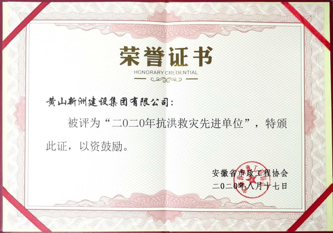2020年8月17日,黃山新洲建設(shè)集團有限公司榮獲“2020年抗洪救災(zāi)先進單位”稱號。