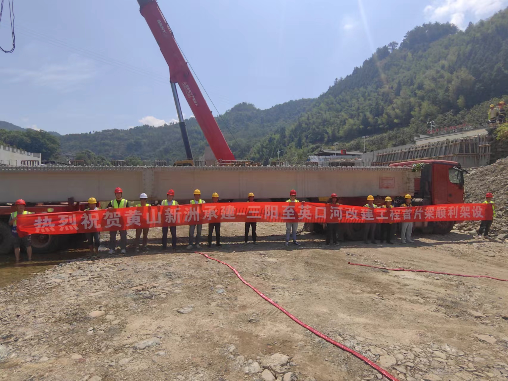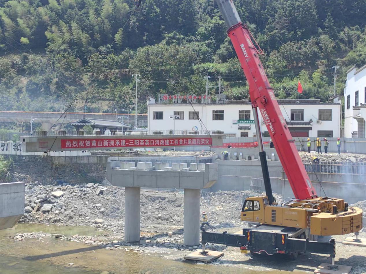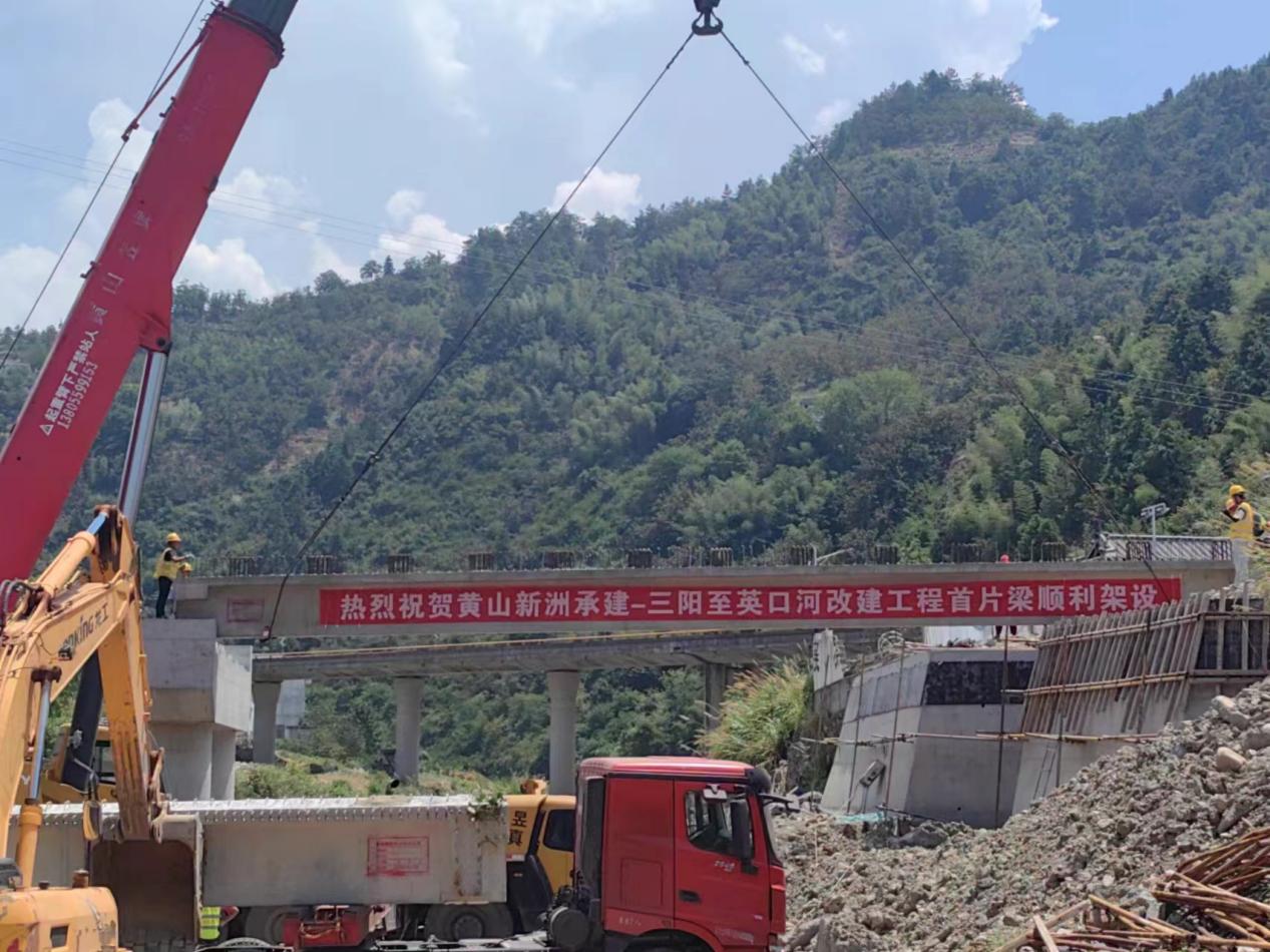 連日的持續(xù)高溫?fù)醪蛔≈啡说牟椒ィ?月5日上午,炎炎烈日之下,隨著煙花爆竹的一聲聲爆炸,我公司承建的歙縣三陽-英坑河口農(nóng)村道路改建工程,K1+148線外橋第一片梁板架設(shè)成功。